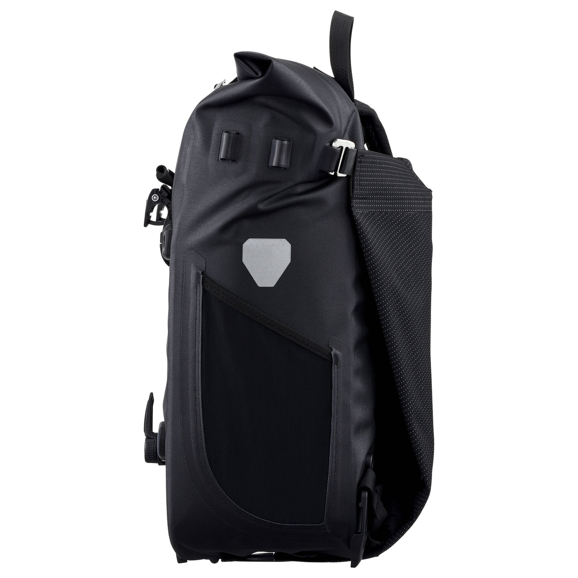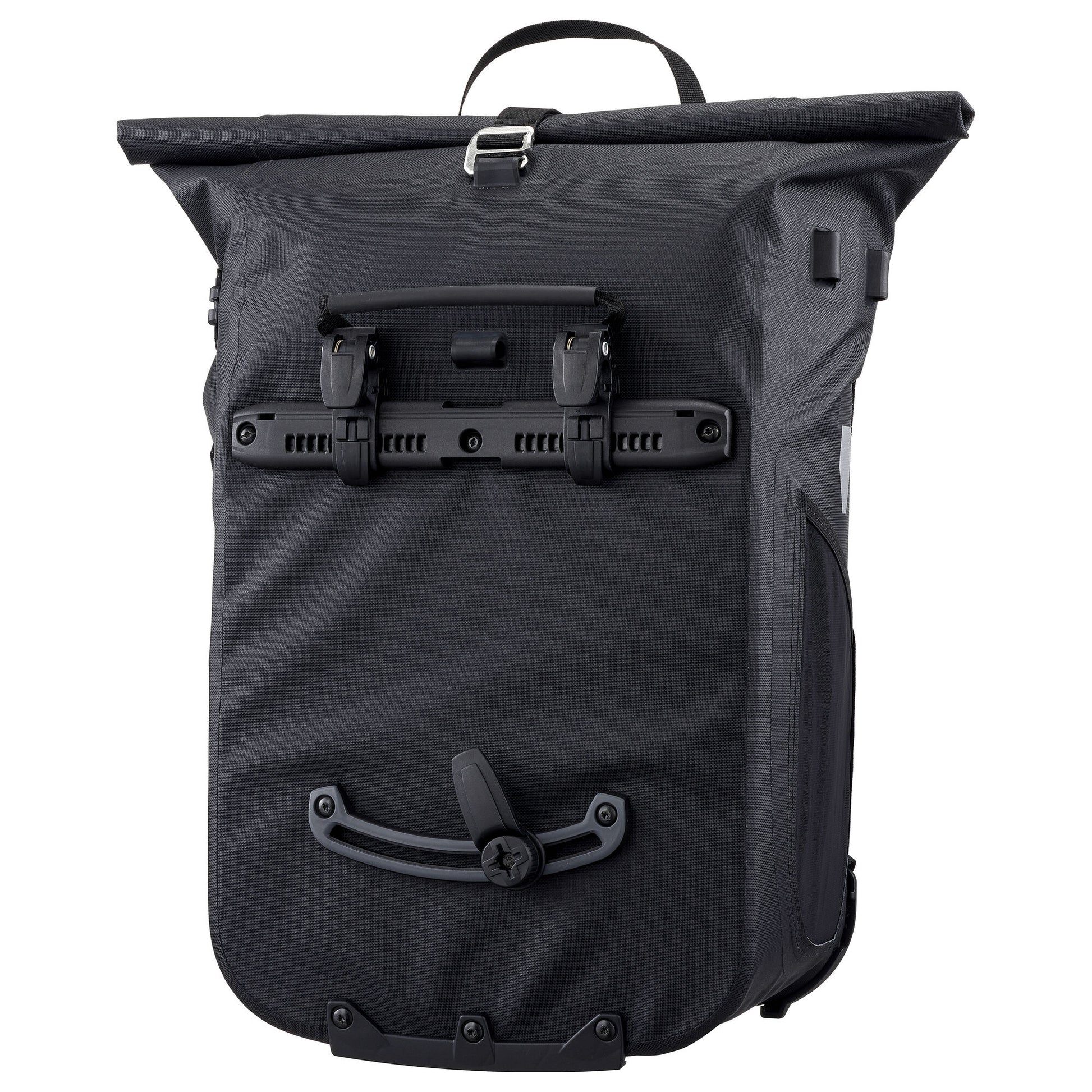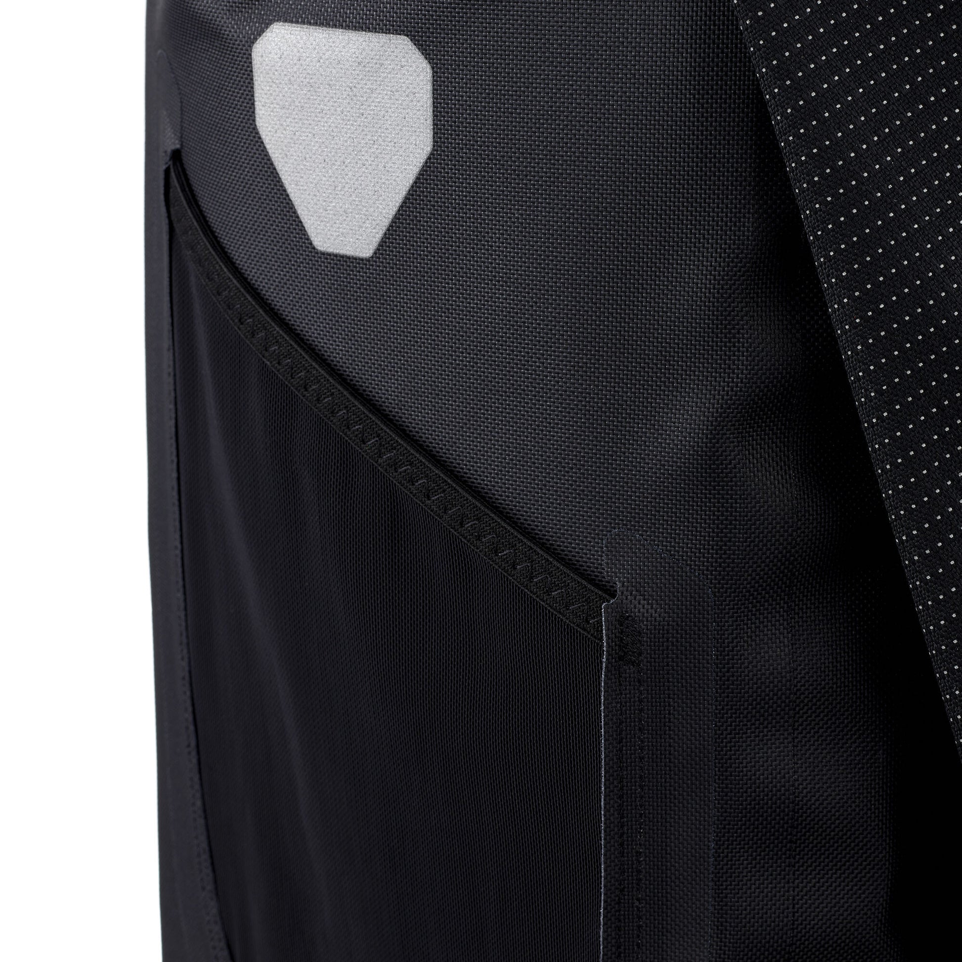 Fitted with the Flap High Visibility, the innovative hybrid of back pack and bike bag becomes the Vario High-Vis. This is thanks to the material on the flap with its integrated reflective thread to provide greater visibility in road traffic. On one side of the bag is the tried and proven Quick- Lock2.1 mounting system for the luggage rack and on the other side a back carrying system with ergonomic shoulder straps. Depending on the current use, the flap covers and protects the side that is not needed at that time. With its integrated pocket, the flap provides additional storage space. There is room in the outer pocket with zipper for small equipment such as smartphones or keys. Inside the waterproof multitalent is a padded laptop compartment than can be accessed via the well-established roll closure. The Vario High-Vis is of course 100% waterproof and produced sustainably in Germany.