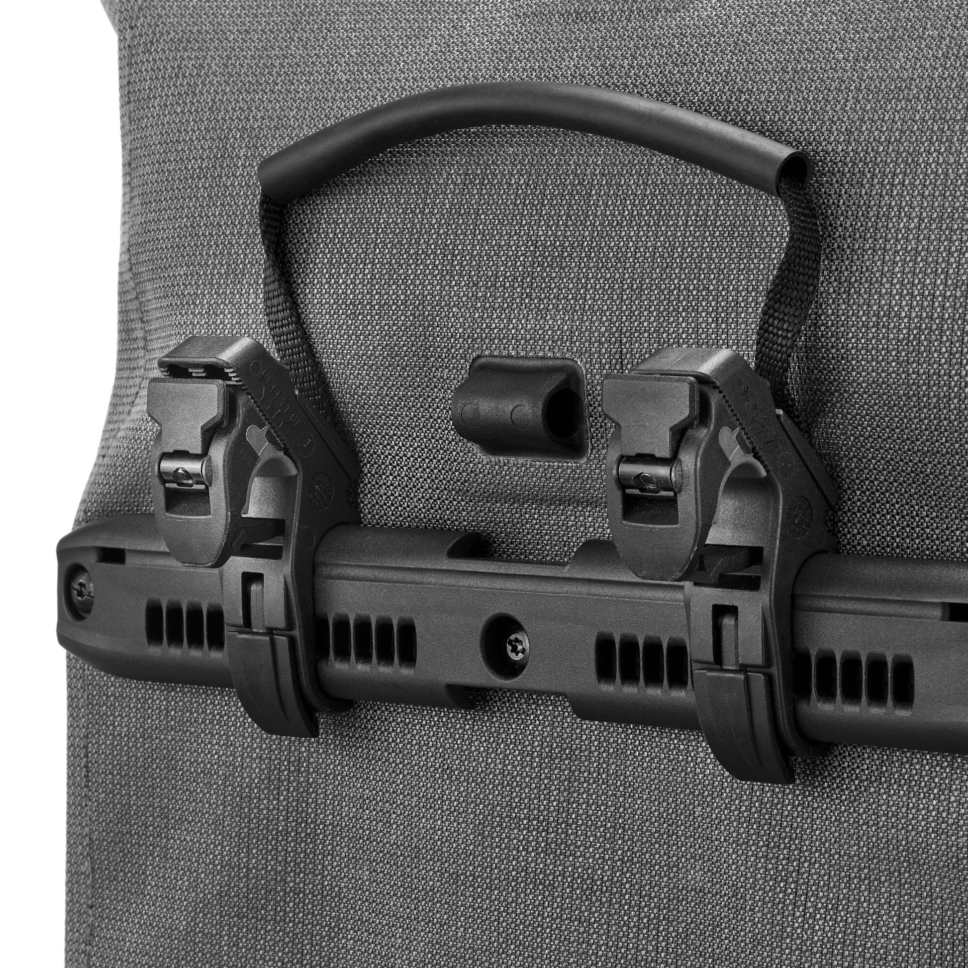 Backpack with roll closure and Quick-Lock2.2 mounting system; can be used as a bike bag or backpack; PU-coated Cordura blend fabric with a pleasant feel; quick, intuitive switch between functions using a reversible front pocket; outer pocket integrated into the flap (not waterproof!); inner pocket with laptop compartment; carrying handle; chest strap; reflectors.